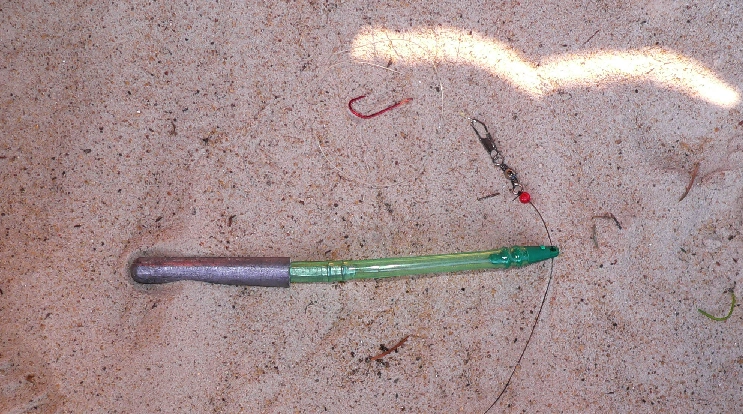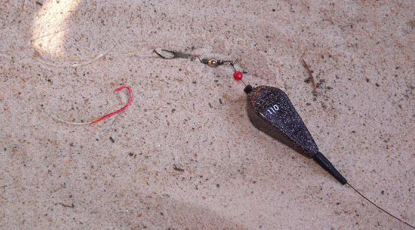 Die zuvor beschriebene Freie Leine mit Vorfach und Karabinerwirbel wird bei dieser Montage nur noch durch ein entsprechendes Wurfgewicht ergänzt.