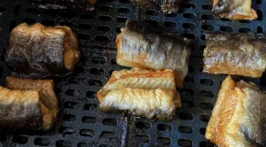 8. Die (filetierten) Aale in ca. 4 cm lange Stücke zerteilen und ggf. mit Küchenpapier abtrocknen. Anschließend die Stücke ebenso in Öl in einer kleineren Pfanne knusprig braten. Es funktioniert auch mit einer (Luft-) Fritteuse.
