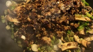 5. Knoblauch, Pilze, Koriander zur Hackpfanne hinzufügen und ca. 10 Minuten braten. Danach die Nüsse, das Kokosöl, Fischsauce und die Frühlingszwiebeln ebenfalls für 5 Minuten darin braten lassen. Dabei oder danach die Chili-, Sririacha- und Sojasauce vermischen.