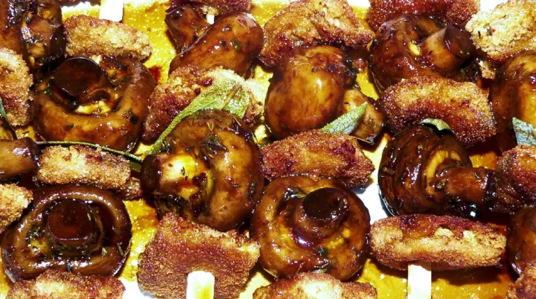 - Nun die Aalfilets abwechselnd mit den Marinierten Champignon auf die Holzspieße stecken. Beginnend mit einem gebratenem Aalfilet. Dazwischen hin und wieder ein Salbeiblatt mit aufspießen. Je Spieß sollten somit 3 panierte Allfilets und 2 marinierte Champignons plus Salbei nach Wunsch entstehen. (6 Stück)