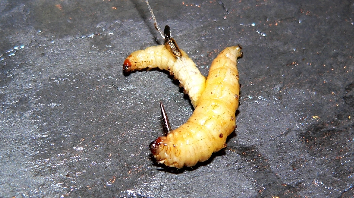 Die Wachsmaden werden entweder zu je 2 Stück oder in Kombination mit einem anderen Köder auf den Haken gesteckt.