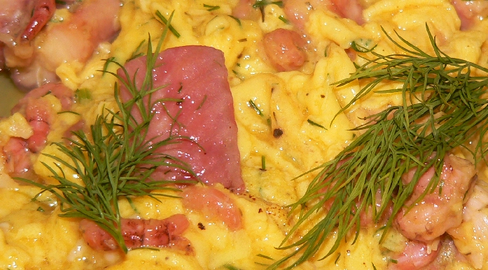 Fett in einer großen Pfanne erhitzen. Ei vorsichtig hineingießen. Krabben und Fisch darauf verteilen. Das Rührei bei schwacher Hitze stocken lassen. Dabei ab und zu mit einem Bratenwender das gestockte Ei zur Mitte hin schieben. Rührei mit restlichem Dill garnieren.